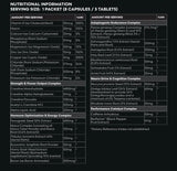 Creatine monohydrate powder, capsule (gelatin [bovine], vegetable cellulose), filler (rice flour), fenugreek seed 50% extract, Panax Ginseng complex (consisting of: Panax ginseng stem & leaf [10% extract] and Panax ginseng root [2% extract / 70% extract]), Acetyl-L-Carnitine HCl, anti-caking agents (vegetable stearic acid, vegetable magnesium stearate, silicon dioxide), bulking agents (maltodextrin, microcrystalline cellulose, croscarmellose), Mucuna pruriens seed (15% extract), carrier (povidone), chloride (from sodium / potassium chloride), ashwagandha 1.5% extract (aerial parts and root), astragalus root (0.5% extract), alpha lipoic acid, sodium (from sodium chloride / phosphate), creatine pyruvate, maca complex (consisting of: maca tuber powder and maca root 0.6% extract), Tribulus terrestris 40% extract (aerial parts), potassium (as potassium chloride), holy basil leaf (2.5% extract), Ginkgo biloba Leaf (24% extract) (standardized to provide 24% ginkgoflavonglycosides and a minimum of 6% terpene lactones), glazing agent (pharmaceutical glaze), Eurycoma longifolia root powder, creatine alpha-ketoglutarate, magnesium (as magnesium oxide), horny goat weed extract ([aerial plant] [Epimedium sagittatum] [providing 10% icariins]), caffeine anhydrous, Eleutherococcus senticosus root (0.8% extract), schisandra fruit (1% extract), phosphorus (from sodium phosphate), calcium (as calcium carbonate), Rhodiola rosea root (3% extract), amla fruit (40% extract), niacin, zinc (as zinc oxide), BioPerine® (black pepper fruit extract), copper (as cupric oxide), boron (as boron aminoate), and vitamin D (as cholecalciferol).