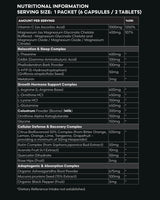 Vitamin C (as ascorbic acid), capsule (gelatin [bovine], vegetable cellulose, hydroxypropyl methylcellulose), organic ashwagandha root powder, L-Arginine (L-Arginine base), citrus bioflavonoid 50% complex (from bitter orange, lemon, orange, lime, tangerine, and grapefruit - providing a minimum of 50mg hesperidin), L-Ornithine HCl, L-Glutamine, magnesium (as magnesium glycinate chelate buffered - magnesium glycinate chelate and magnesium oxide / magnesium oxide / magnesium citrate), L-Theanine, colostrum powder (bovine) (milk), filler (rice flour), bulking agents (calcium carbonate, organic tapioca maltodextrin), anti-caking agents (vegetable magnesium stearate, silicon dioxide, vegetable stearic acid, organic silica concentrate), L-Lysine HCl, ornithine alpha-ketoglutarate, glycine, GABA (gamma-Aminobutyric acid), phellodendron bark powder, Mucuna pruriens seed (15% extract), 5-HTP (5-hydroxytryptophan) (Griffonia simplicifolia seed), rutin complex, quercetin dihydrate, aqueous film coating (purified water, hydroxypropyl methylcellulose, and vegetable glycerin), acerola fruit (4:1 extract), organic black pepper (fruit), rose hips (fruit), melatonin, and organic film coating (purified water, organic maltodextrin, organic sunflower lecithin, organic palm oil and organic guar gum).